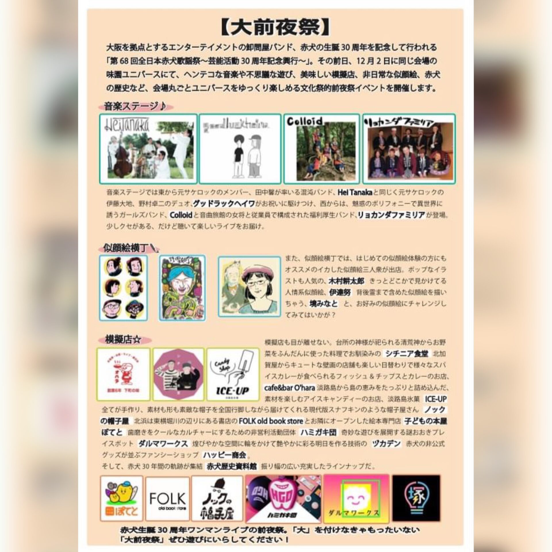 その前日、12 月 2 日に同じ会場の味園ユニバースにて、ヘンテコな音楽や不思議な遊び、 美味しい模擬店、非日常な似顔絵、赤犬の歴史など、会場丸ごとユニバースをゆっくり楽し める文化祭的前夜祭イベントを開催します。